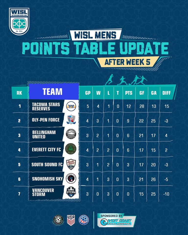 Following the weekend’s results, Tacoma Stars Reserves lead the standings with a 4-1-0 record, 12 points, and a +15 goal differential, riding a one-game winning streak. Oly-Pen Force sits in second at 3-1-0 with 9 points and a -3 goal differential, coming off three consecutive wins. Bellingham United is third at 2-1-0 with 6 points and a +4 goal differential, boasting a two-game winning streak. Everett City FC holds fourth place at 2-2-0 with 6 points and a +2 goal differential, after dropping their most recent match. South Sound FC is fifth at 1-2-0 with 3 points and a -3 goal differential, followed by Snohomish Sky in sixth at 1-3-0 with 3 points and a -5 goal differential. Vancouver Storm remains in seventh place, winless at 0-3-0, with no points and a -10 goal differential.